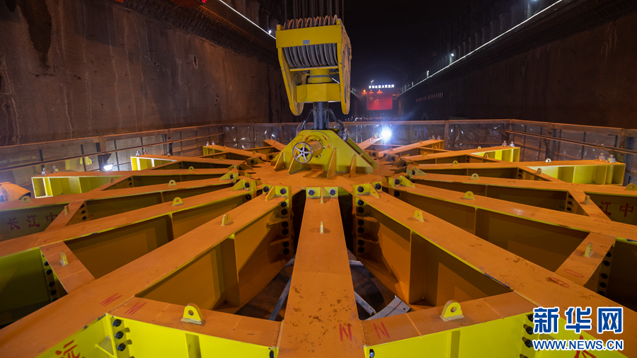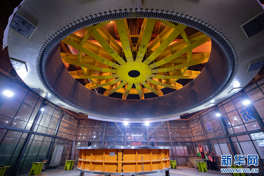 6月30日,瑪爾擋水電站地下廠房內(nèi),工作人員正在進(jìn)行首臺機(jī)組定子吊裝作業(yè)。新華網(wǎng) 潘彬彬 攝