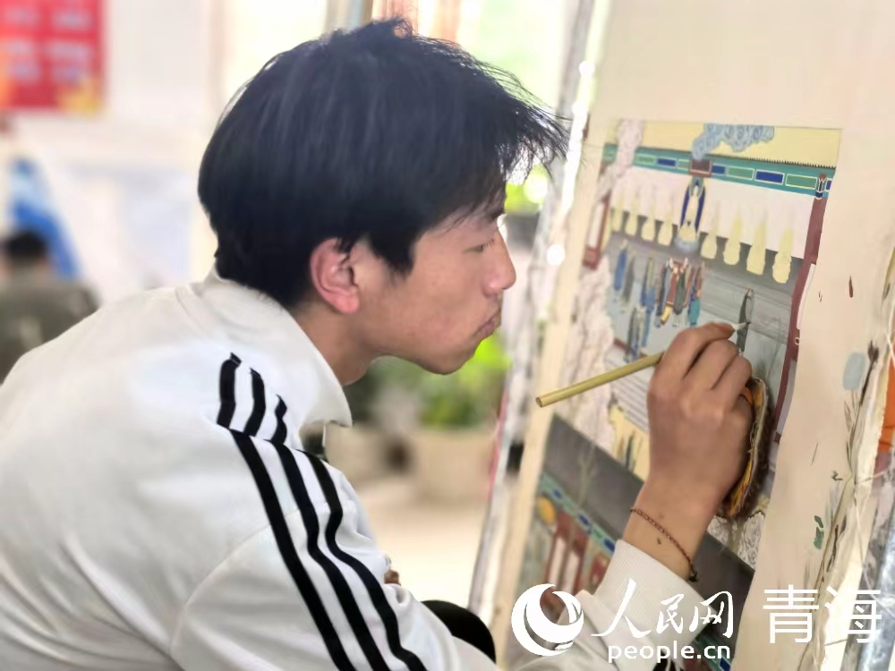 學(xué)徒細致描繪唐卡。人民網(wǎng) 馬可欣 攝