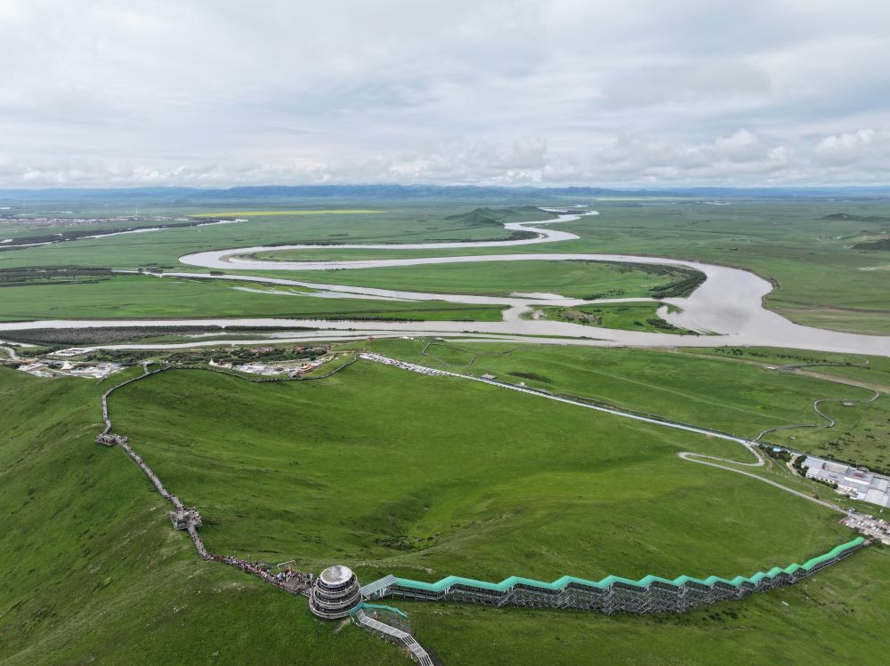 7月14日,游客游覽若爾蓋縣黃河九曲第一灣景區(qū)(無人機(jī)照片)。新華社記者 邢拓 攝