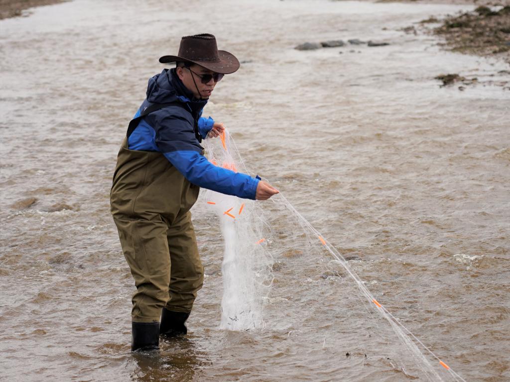 李偉在長江南源當(dāng)曲河畔采集魚類樣本。新華社記者 陳杰 攝