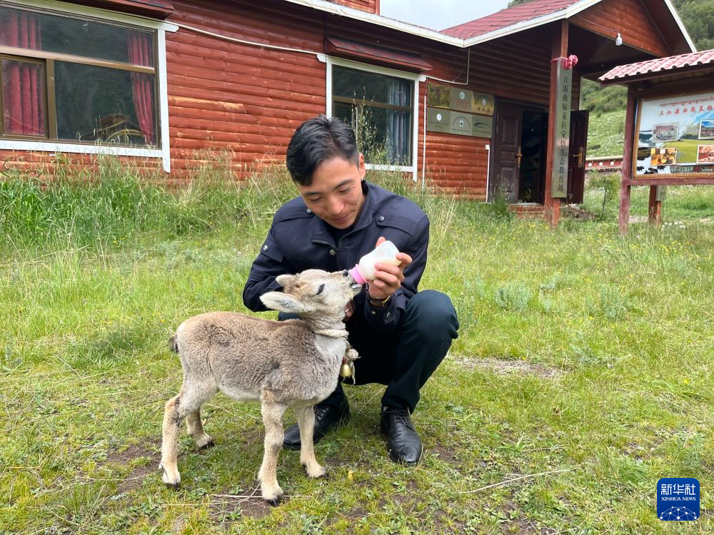 “咩,咩”……門外傳來羊羔的叫聲,旦增拉巴拿著剛剛加熱的奶瓶,向外走去?!斑@只羊羔是我們今年5月從野外救助回來的,當時因母羊被雪豹獵食,小羊落單后被我們發(fā)現(xiàn)了?!钡┰隼蛯⑿⊙驍堅诟埃炀毜亟o它喂奶,儼然一位“奶爸”。