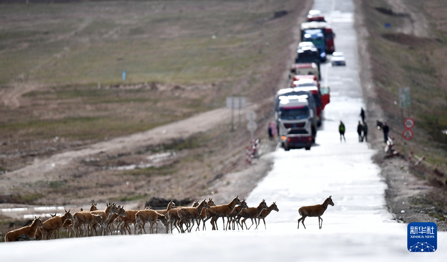 7月28日,一群藏羚羊通過青藏公路前往三江源地區(qū)的棲息地。 新華社記者 張宏祥 攝