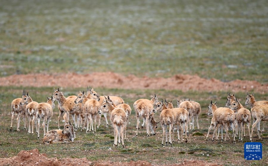 7月28日,一群藏羚羊在青藏公路附近活動。新華社記者 韓方方 攝
