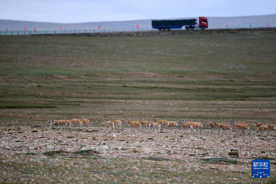 7月28日,一群藏羚羊通過青藏公路后前往棲息地。新華社記者 韓方方 攝