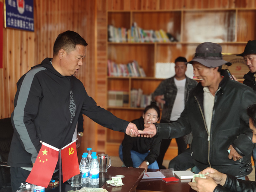 “振業(yè)振興新征程 旺達村分紅大會”的橫幅在村活動中心會議室內鮮艷顯眼,村民們興高采烈,早早地等候在這里領取分紅金?!敖衲炅鬓D費總計130000元,每戶可分紅5200元?!狈旨t儀式上,上木拉黨委書記格絨次乃向村民們介紹了旺達村房屋流轉、荒地收益情況和民宿產業(yè)下一步規(guī)劃。在場村民臉上無不洋溢著幸福的笑容,高興地鼓起了掌。