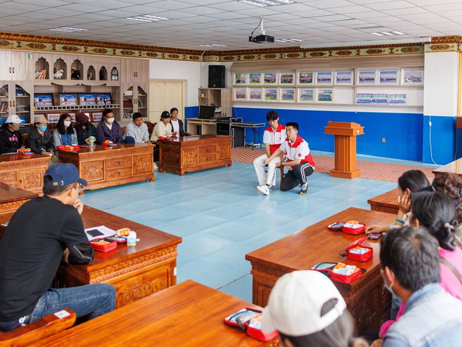 依托紅十字會(huì)專業(yè)基礎(chǔ),支教隊(duì)開(kāi)設(shè)了應(yīng)急救護(hù)課堂教學(xué)活動(dòng),從海姆立克急救法、三角巾的使用等基礎(chǔ)技能著手,結(jié)合“理論+實(shí)踐”為師生開(kāi)展了一次生動(dòng)的急救培訓(xùn)。課堂上,AED的使用以及心肺復(fù)蘇、急救包扎等應(yīng)急技能的教學(xué)齊頭并進(jìn),讓師生們學(xué)到了科學(xué)的應(yīng)急救護(hù)知識(shí)。課程結(jié)束后,支教隊(duì)在校園多地放置了急救包,為師生提供基礎(chǔ)的應(yīng)急保障。