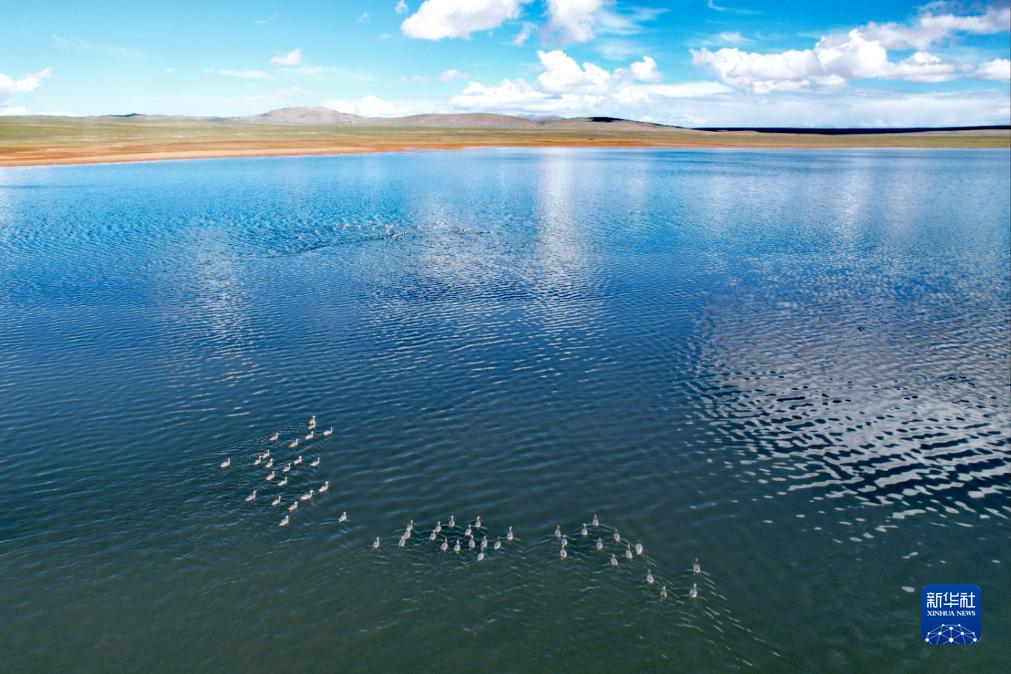 長江源區(qū)的水鳥群(7月26日攝,無人機(jī)照片)。 新華社記者 劉詩平 攝