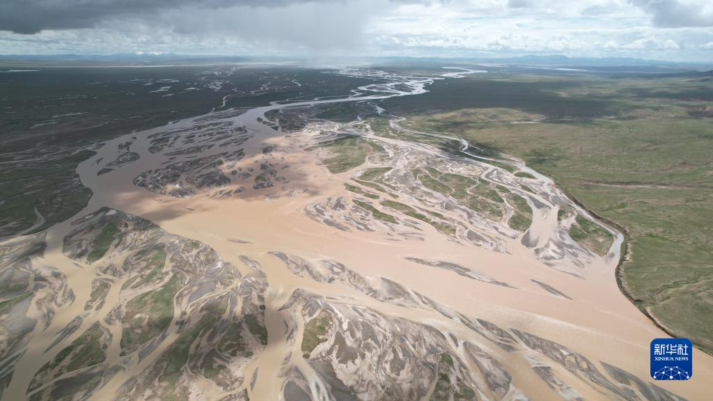 沱沱河與當(dāng)曲匯合處的囊極巴隴,辮狀河道寬度超過3千米(7月26日攝,無人機(jī)照片)。 新華社記者 劉詩平 攝