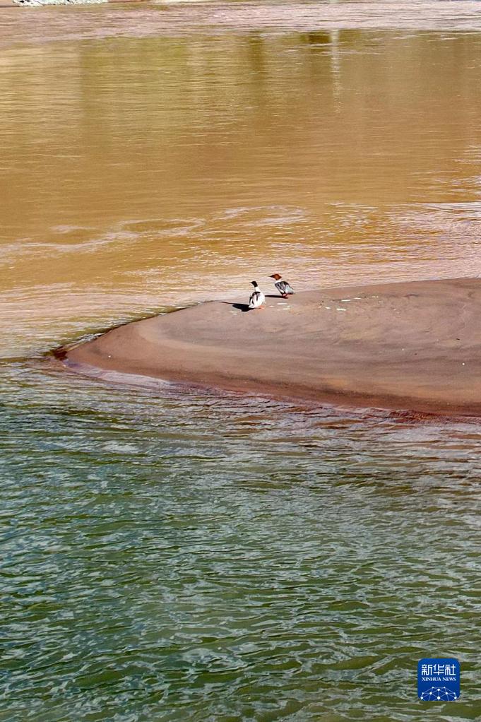 通天河與巴塘河交匯處的兩只水鳥(7月22日攝,無人機(jī)照片)。 新華社記者 劉詩平 攝