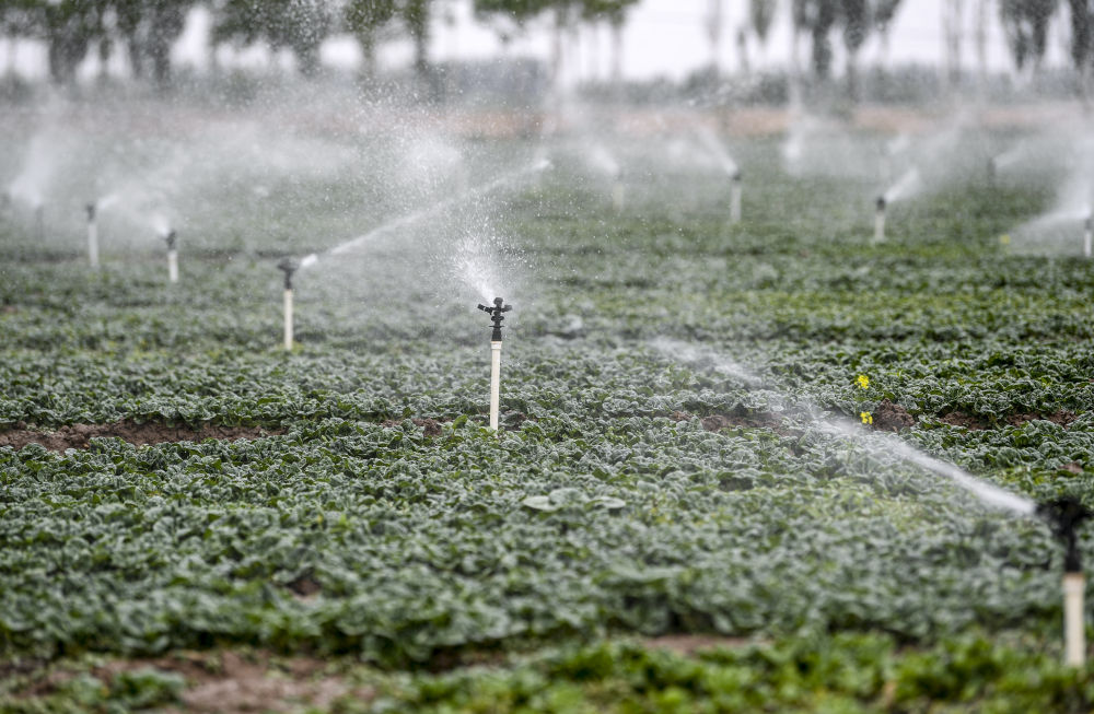 2023年5月25日,在寧夏銀川市永寧縣望洪鎮(zhèn)宋澄村冷涼蔬菜種植基地,小型噴灌節(jié)水設(shè)備在進行噴灌作業(yè)。新華社記者 馮開華 攝
