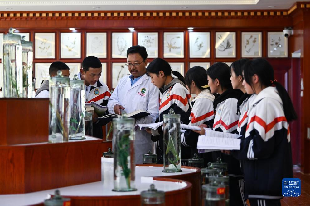 9月8日,在果洛藏族自治州職業(yè)技術學校,藏醫(yī)醫(yī)療與藏藥專業(yè)學生在草藥標本館內學習辨認藥材。新華社記者 張龍 攝