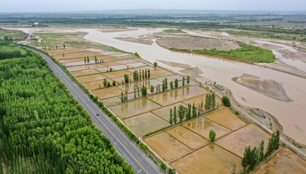 流經寧夏青銅峽市境內的黃河,滋潤著岸邊水稻和各種植被(無人機照片,5月25日攝)。新華社記者馮開華 攝