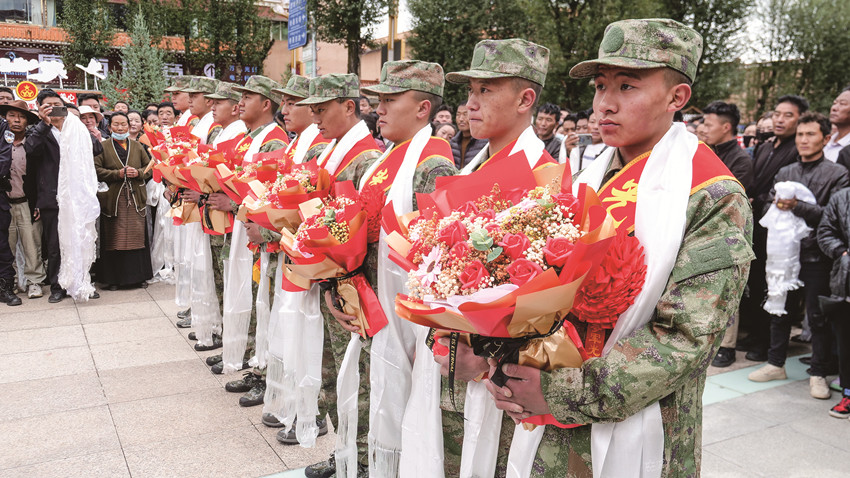 新兵們精神抖擻、氣宇軒昂,身著軍裝、胸戴大紅花和家鄉(xiāng)父老敬獻(xiàn)的潔白哈達(dá),在格薩爾廣場整裝出發(fā),滿懷豪情,踏上報(bào)效國家的新征程,展現(xiàn)出新時(shí)代青年積極響應(yīng)祖國號召,矢志報(bào)國的精神風(fēng)貌。