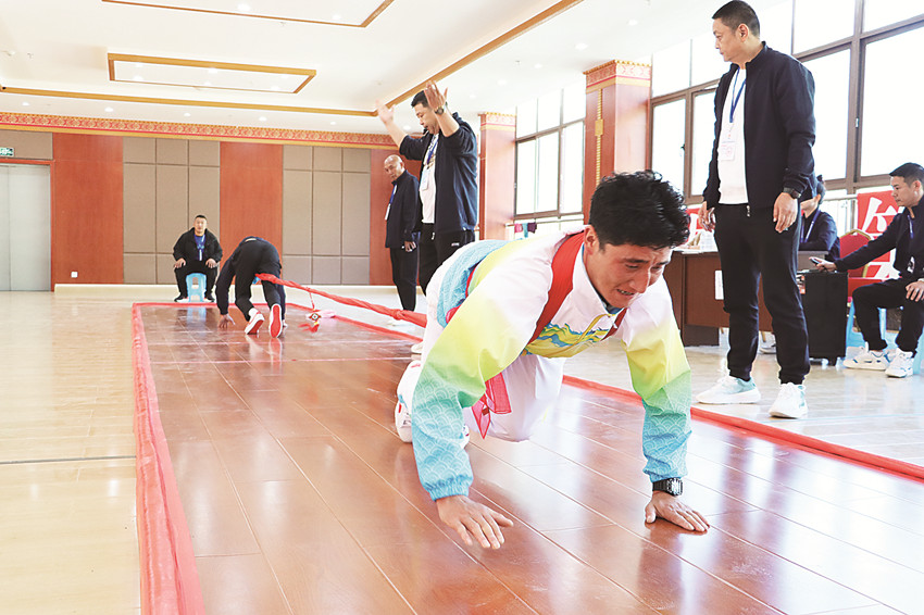 “參賽選手雙手雙腳全部著地,奮力向前拉動,不僅對選手的肩背、腰腹和腿部力量要求高,更考驗選手的爆發(fā)力和體能?!北荣愔?,裁判長熊安平一邊關(guān)注著賽場,一邊向記者介紹押加比賽。