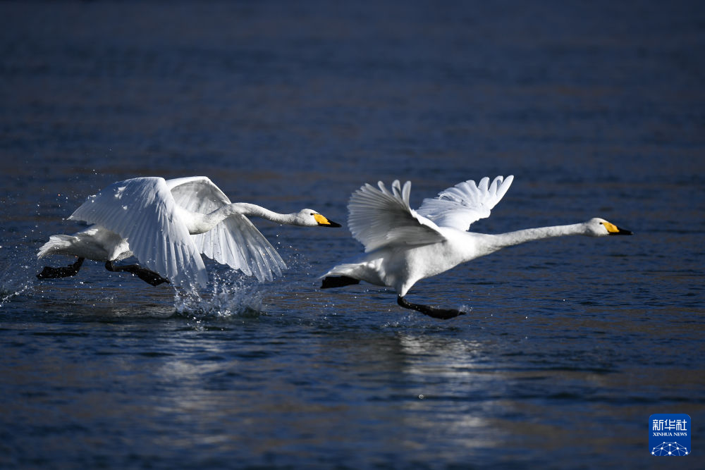 這是在青海省海南藏族自治州貴德縣境內(nèi)的黃河濕地拍攝的天鵝(2021年12月24日攝)。新華社記者張龍 攝