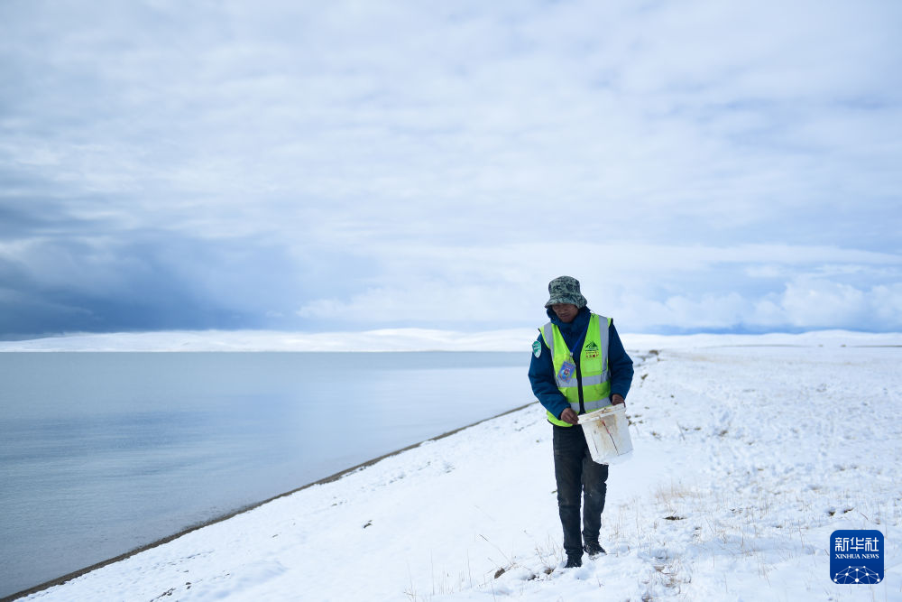 2021年10月20日,在青海省果洛藏族自治州瑪多縣扎陵湖鄉(xiāng)勒那村,三江源國家公園黃河源園區(qū)生態(tài)管護(hù)員在扎陵湖邊撿拾垃圾。新華社記者張龍 攝