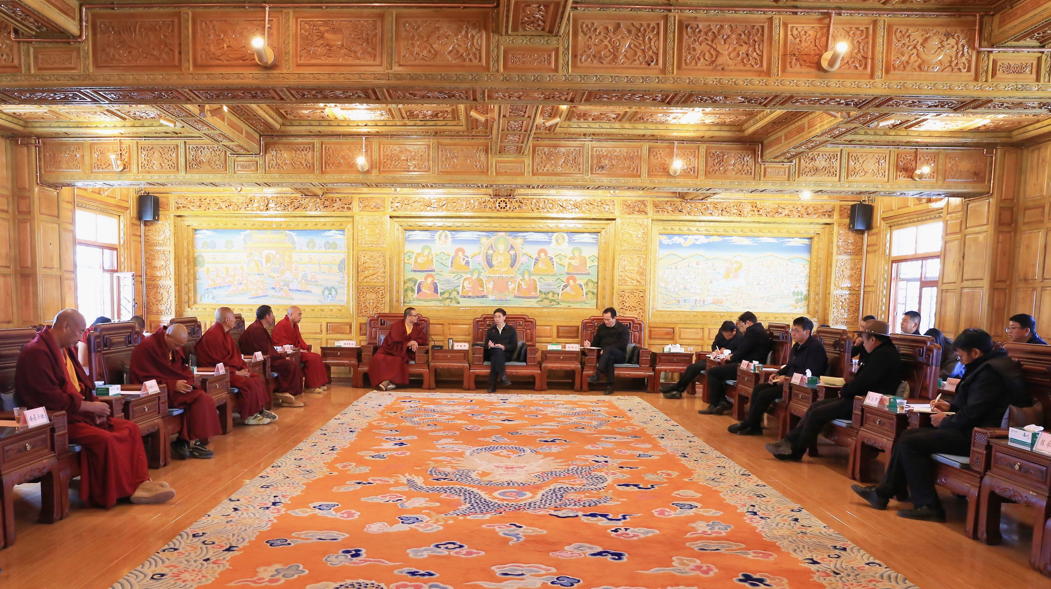 在松贊林寺,羅朝峰與宗教界代表人士深入交流座談,詳細了解僧人學修、生活等情況,面對面傾聽他們的心聲、訴求,引導僧人們從多年來國家面貌、人民生活發(fā)生的變化,松贊林寺基礎設施、僧人修行條件的變化中憶苦思甜,感念黨恩。希望他們珍惜和諧穩(wěn)定的大好局面和良好的修行生活條件,深入踐行習近平總書記提出的“政治上靠得住、宗教上有造詣、品德上能服眾、關鍵時起作用”政治要求,繼承和發(fā)揚愛國愛教的優(yōu)良傳統(tǒng),進一步鑄牢中華民族共同體意識。