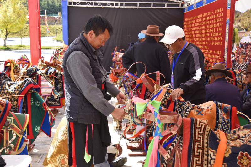 10月30日,由州委、州政府主辦的世界的“香格里拉”金秋賽馬節(jié)民間鞍馬具展示交流活動在香格里拉市民族體育中心綜合體育場舉辦。圖為鞍馬具愛好者在現(xiàn)場參觀。