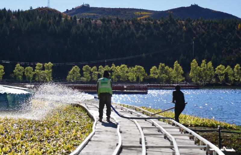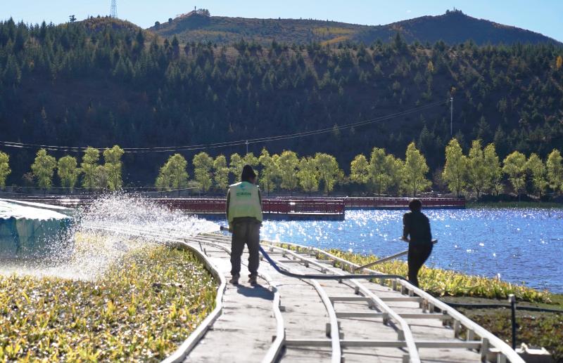 圖為工人在拉姆央措湖畔鋪設(shè)環(huán)湖步行棧道、鋪貼路面石板。目前,拉姆央措湖保護治理與生態(tài)修復(fù)基礎(chǔ)設(shè)施建設(shè)工程已完成總工程量的95%,正加緊推進路面石板鋪貼、木棧道安裝、吸煙亭改造等掃尾工作。拉姆央措湖水清景美煥新顏。