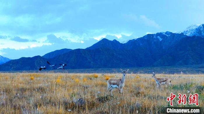 黑頸鶴、鵝喉羚多種野生動物“同框”現(xiàn)身青海都蘭湖國家濕地公園