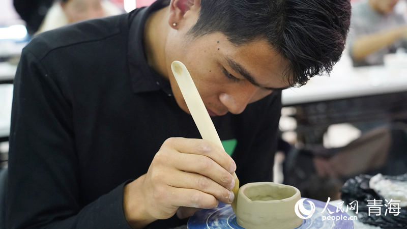 制作陶瓷坯體,打磨坯體內(nèi)外……踏進(jìn)班瑪縣電子商務(wù)公共服務(wù)中心培訓(xùn)室,十幾名學(xué)員正在學(xué)做黑陶,拉坯機(jī)轉(zhuǎn)過(guò)一圈又一圈,學(xué)員們打磨一遍又一遍,沾著泥巴的雙手,十分專注的眼神,將人帶入班瑪黑陶的世界,木板與土坯摩擦之間,一件件班瑪黑陶作品就此誕生。