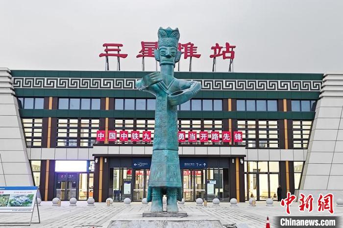 三星堆站位于德陽廣漢市南興鎮(zhèn)與向陽鎮(zhèn)交界處,距廣漢市區(qū)約5公里,距三星堆遺址約5公里,站場(chǎng)規(guī)模為2臺(tái)4線。車站廣場(chǎng)上,豎立著一尊青銅立人像,站房外立面將三星堆出土的青銅人面具抽象為車站整體造型,局部點(diǎn)綴回字紋雕花的仿古元素。同時(shí),裝飾裝修深化設(shè)計(jì)中將外立面檐口褐色調(diào)整為青銅色,彰顯了三星堆深遠(yuǎn)的人文背景?!败囌菊痉恳匀嵌殉鐾恋那嚆~人面具造型為靈感?!敝需F九局成蘭站房項(xiàng)目部總工程師楊禮銘表示,施工過程中對(duì)鋁板內(nèi)部龍骨布置及鋁板分格進(jìn)行了數(shù)次優(yōu)化,順利完成站房裝飾裝修工程,投用后將成為當(dāng)?shù)匾坏貥?biāo)性建筑。