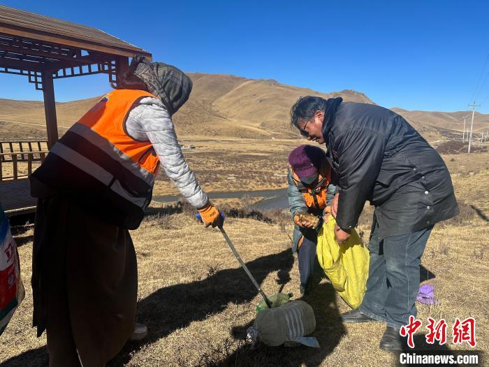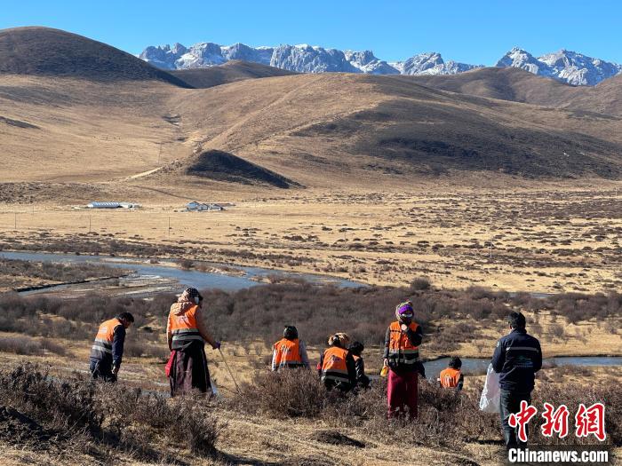 圖為斗格加(右一)和管護(hù)員們正在撿拾垃圾。劉洋 攝