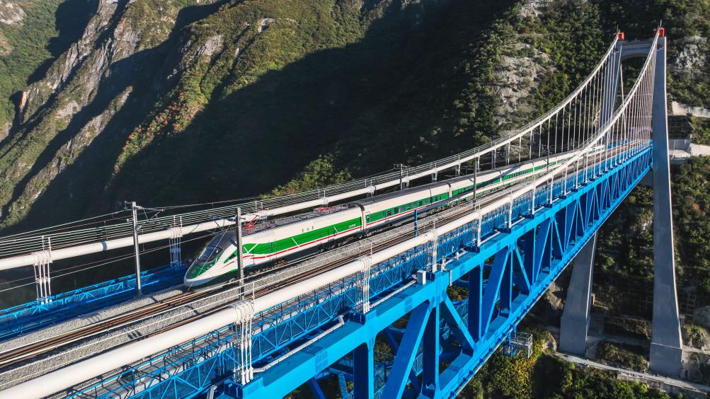 圖為11月9日,麗香鐵路動態(tài)檢測期間,復(fù)興號列車駛過虎跳峽金沙江鐵路大橋。(中國鐵路昆明局集團公司供圖)