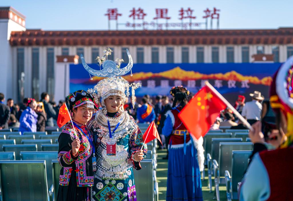 11月26日,參加麗香鐵路開通儀式的少數(shù)民族代表在開通儀式上拍照留念。新華社記者 陳欣波 攝