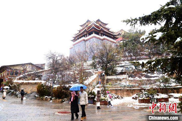 圖為游客游覽雪中的獨(dú)克宗古城。鄒鵬 攝