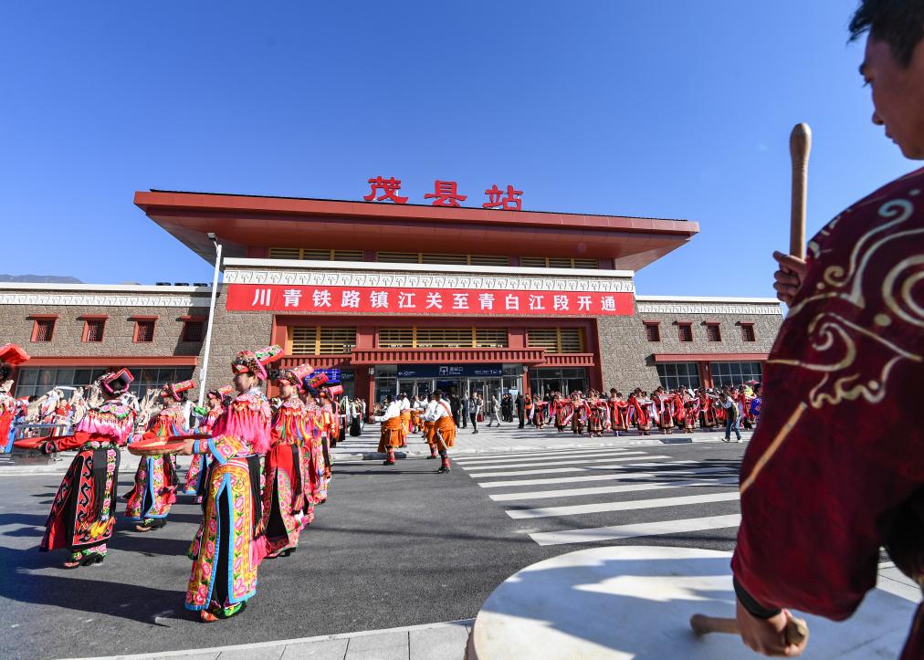 11月28日,在川青鐵路茂縣站,當(dāng)?shù)馗髯迦罕娫谡厩皬V場慶祝鐵路開通運營。 新華社記者 王曦 攝