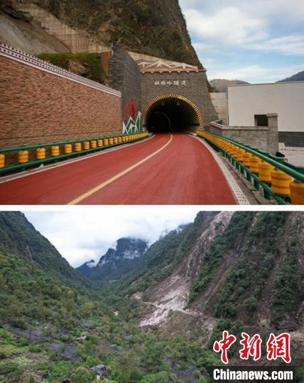 上圖為海螺溝景區(qū)重建的杜鵑林隧道建成后。下圖為建成前的隧道附近受損道路情況。(拼圖)蜀道集團(tuán)供圖