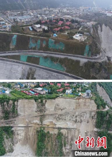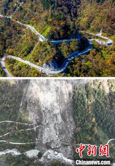 上圖為建成后的絕壁公路。下圖為地震后的絕壁公路受損情況。(拼圖)蜀道集團(tuán)供圖