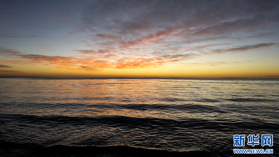 寒冬時節(jié),青海湖顯露出寧靜內(nèi)斂的一面。清晨,在波浪聲與風(fēng)聲的伴奏下,一輪紅日緩緩升起,將天邊的云染成了彩色,與波光粼粼的湖面相映,宛如一幅絕美的風(fēng)景畫。