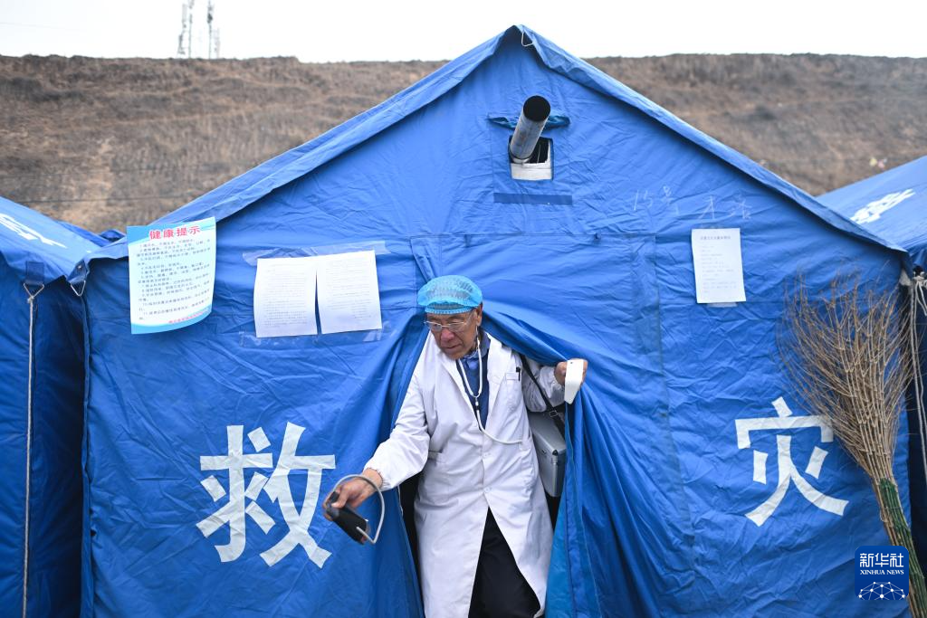 12月22日,完么仁增在牙木村安置點(diǎn)測(cè)量完群眾血壓后走出帳篷。新華社記者 張龍 攝