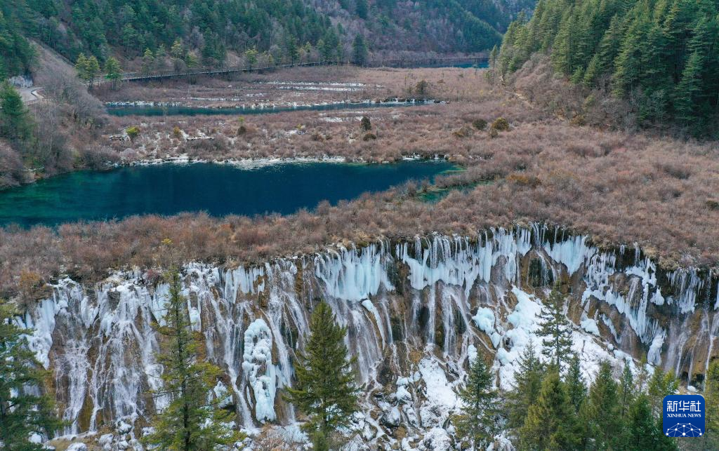 這是1月4日在四川省九寨溝風景名勝區(qū)拍攝的諾日朗瀑布形成的冰瀑景觀(無人機照片)。新華社記者 王曦 攝