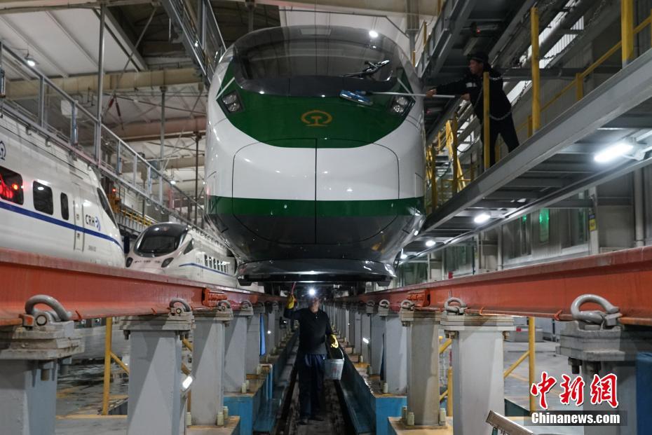 1月30日晚,在青藏鐵路公司西寧車輛段動車運用車間,工作人員在無電作業(yè)時進行動車清潔。中新社記者 馬銘言 攝