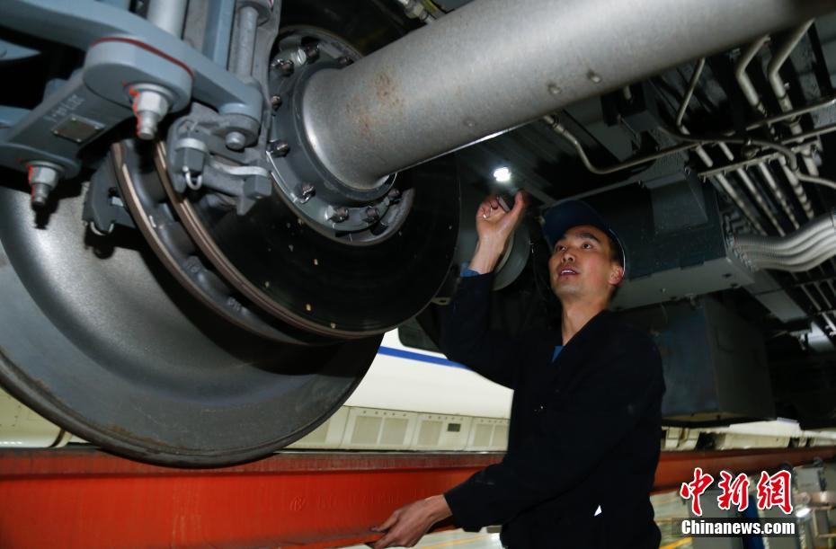 1月30日晚,在青藏鐵路公司西寧車輛段動車運用車間,地勤機械師在無電作業(yè)時進行動車組走行部關鍵部位的檢修。中新社記者 馬銘言 攝