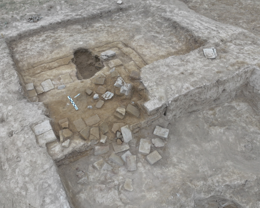 此外,考古隊(duì)員在最大的房址發(fā)現(xiàn)方形磚砌祭臺。專家表示,磚砌祭臺屬熱水墓群中的首次發(fā)現(xiàn),祭臺中發(fā)現(xiàn)大量磚塊。通過陵園及祭祀建筑的規(guī)模、數(shù)量等線索推測,這個墓葬的規(guī)格、墓主人的身份等級要高于2018血渭一號墓。