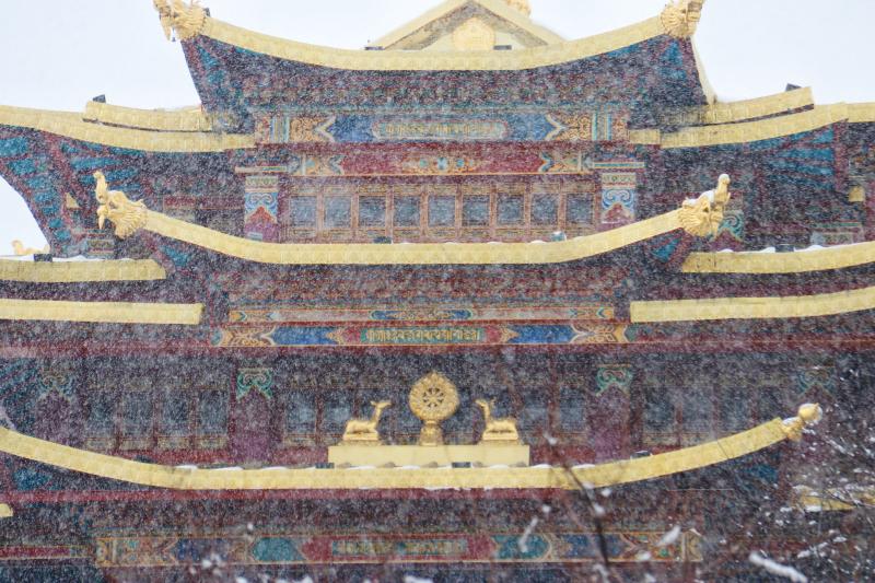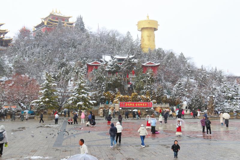 春節(jié)后第一場雪,雪花紛紛揚揚飄落,為香巴拉公園內(nèi)的各處景觀增加了別樣意趣。