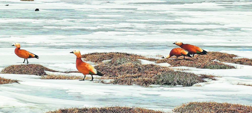 3月8日,青海省玉樹藏族自治州隆寶灘國際重要濕地迎來春天首批赤麻鴨12只,身披赤黃褐色的“彩衣”赤麻鴨,或游走在草灘上棲息覓食,或展翅翱翔天空,或在冰面上歇息,讓隆寶灘國際重要濕地在春季充滿了勃勃生機。