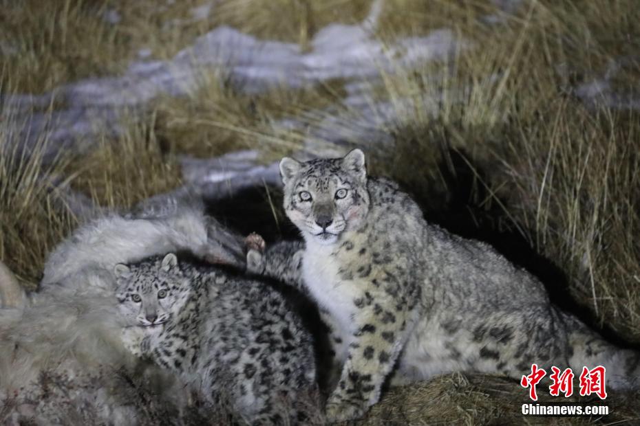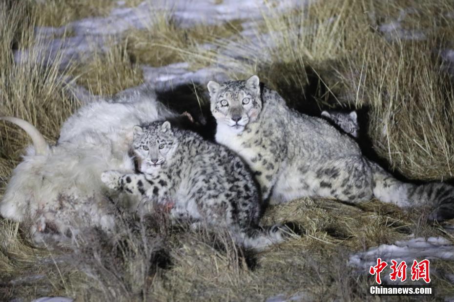 近日,在青海省海西蒙古族藏族自治州天峻縣快爾瑪鄉(xiāng),攝影師近距離拍攝到3只雪豹進(jìn)食畫面。畫面中,3只雪豹正在啃食一只白色牦牛,其中一只雪豹體型較大,大多數(shù)時(shí)間在“放哨”,其他兩只雪豹體型稍小,但一直在“大快朵頤”,吃飽后“歡快”離開。雪豹大多生活在海拔2500米至5000米的高原地區(qū),屬國家一級保護(hù)動(dòng)物,被世界自然保護(hù)聯(lián)盟(IUCN)列為瀕危物種,由于獨(dú)來獨(dú)往,行蹤詭秘,又被人們稱為“雪山隱士”“雪山之王”。