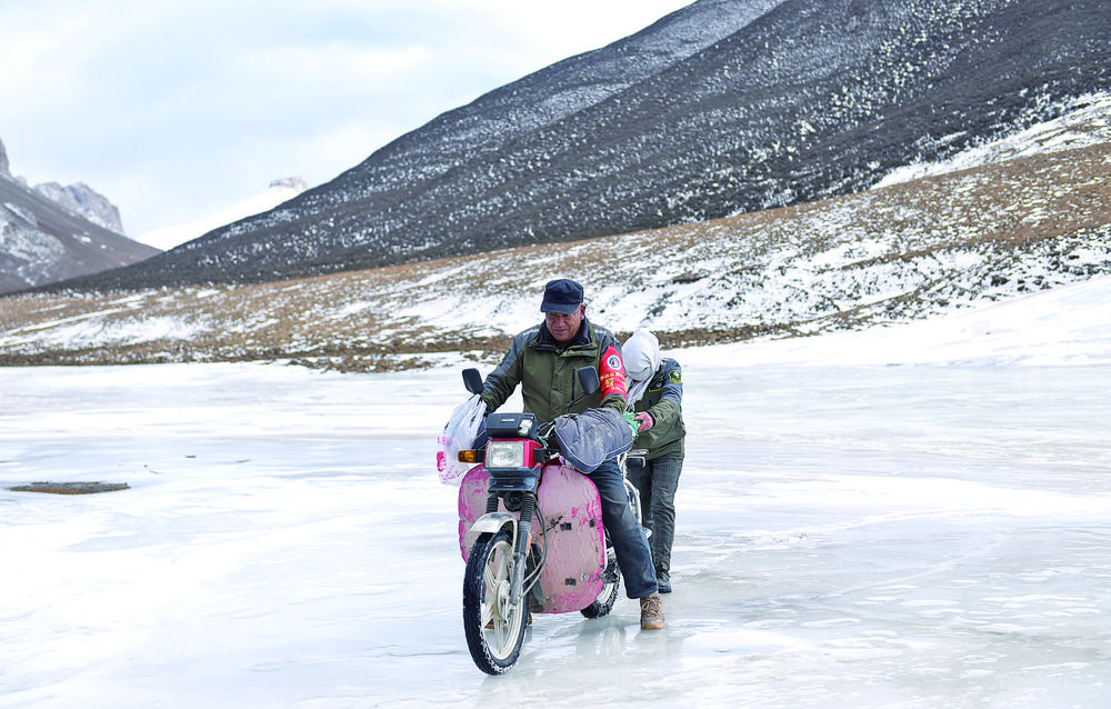 每天巡護,要沿著冰面行走時,葉抓西才郎推著摩托車,宋成芳在后面扶著,即便這樣,還會摔倒,“遇上一些小坡,只能將摩托車放倒,拴上一根繩子,慢慢滑下去,到了上坡,還是要把摩托車放倒,慢慢拉上去?!?/p>