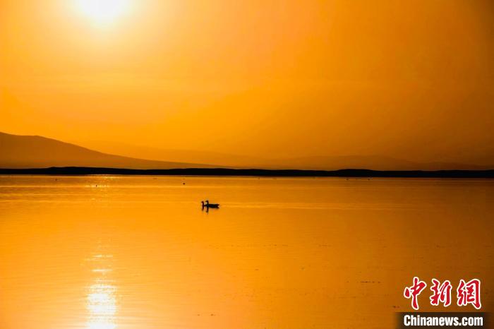 圖為青海湖夕陽如夢如幻。趙海梅 攝