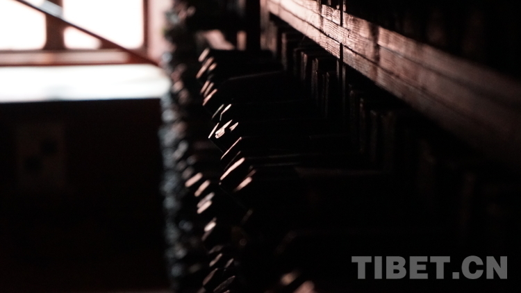 圖為德格印經(jīng)院內(nèi)擺滿(mǎn)印版的木架,因?yàn)橛〗?jīng)院不通電、不掌燈,所以?xún)?nèi)部光線(xiàn)較為昏暗 攝影:張宇