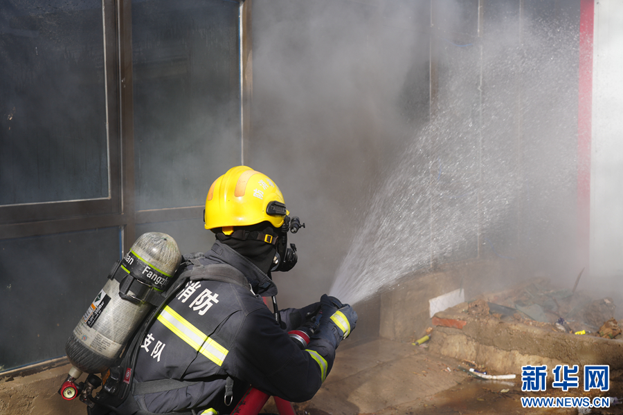 在演練現(xiàn)場,消防員正在撲救模擬的房屋火災(zāi)。(海南州消防救援支隊(duì)供圖)