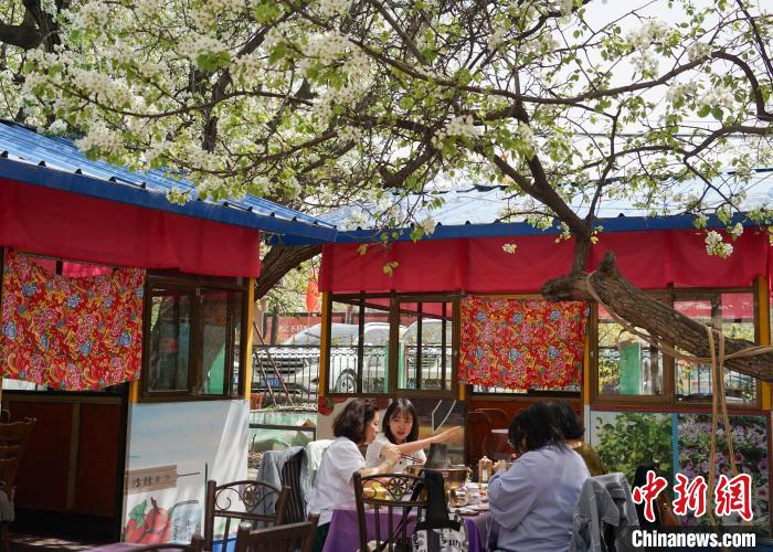 圖為游客正在梨花盛開的農(nóng)家樂中用餐。馬銘言 攝