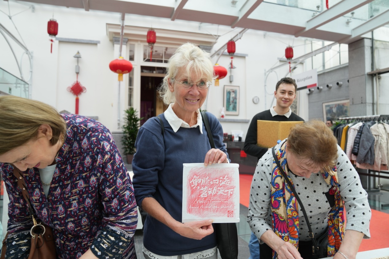 從法國巴黎到比利時(shí)布魯塞爾,傳拓體驗(yàn)區(qū)人山人海。傳拓工藝可以將每一片傳統(tǒng)的“七子餅”茶量身定制成層次分明、索條清晰的獨(dú)特“身份證”,而隨著墨棒掃過,一幅幅“茶馬古道”“云騰四海·茗動(dòng)天下”拓畫躍然紙上。引得嘉賓忍不住上手體驗(yàn),并將制作好的作品珍藏。