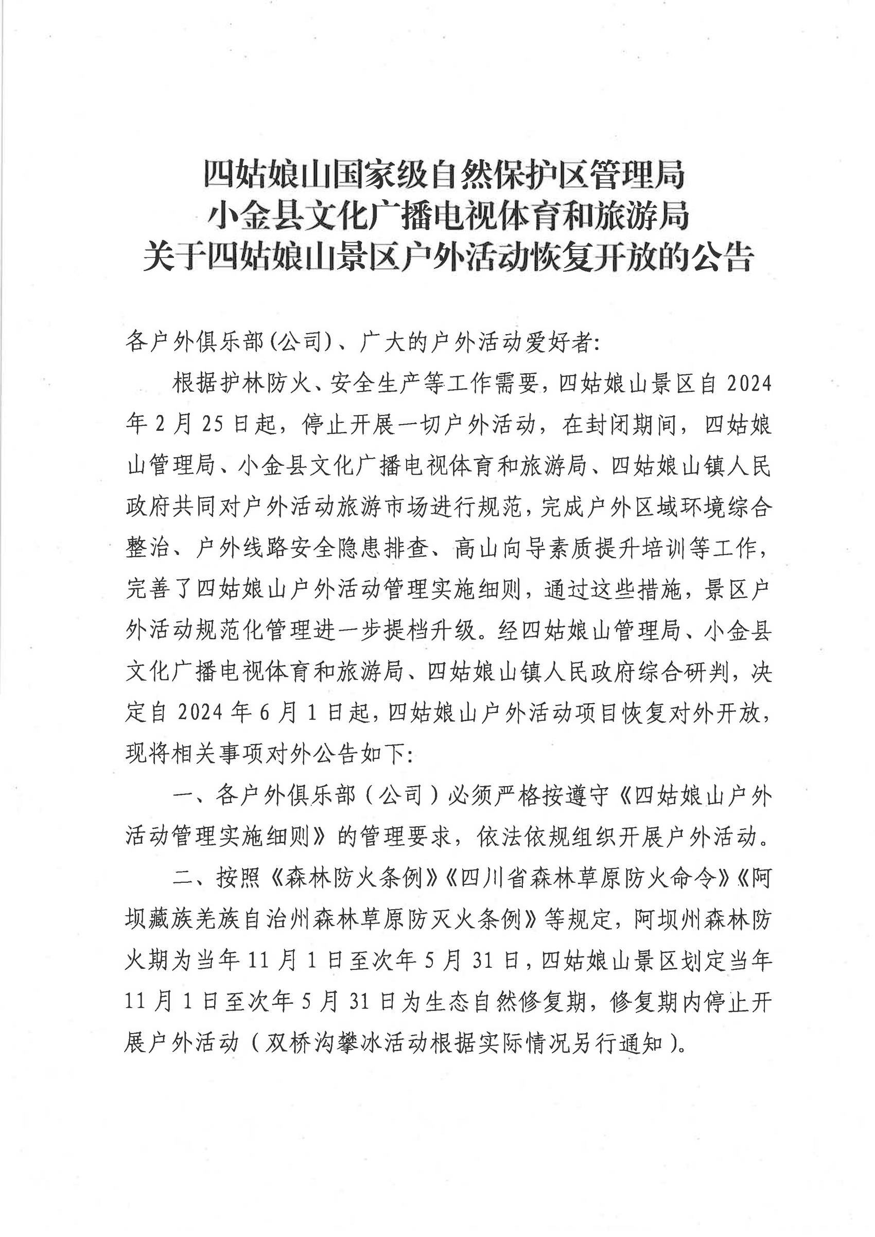 經四姑娘山管理局、小金縣文化廣播電視體育和旅游局、四姑娘山鎮(zhèn)人民政府綜合研判,決定自2024年6月1日起,四姑娘山戶外活動項目恢復對外開放。公告要求各戶外俱樂部(公司)必須嚴格遵守《四姑娘山戶外活動管理實施細則》的管理要求,依法依規(guī)組織開展戶外活動。