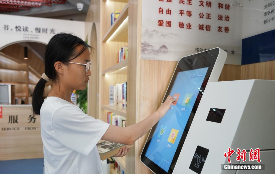 6月19日,市民在青海省海西蒙古族藏族自治州格爾木市一城市書房內(nèi)借閱書籍。中新社記者 馬銘言 攝